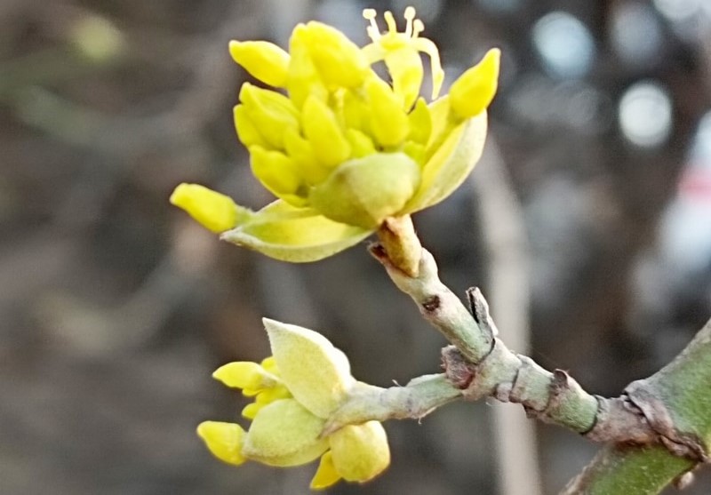 Apró, sárga virágait már január-februártól hozza a hajtásain, enyhébb teleken azonban már decemberben is virágozhat.