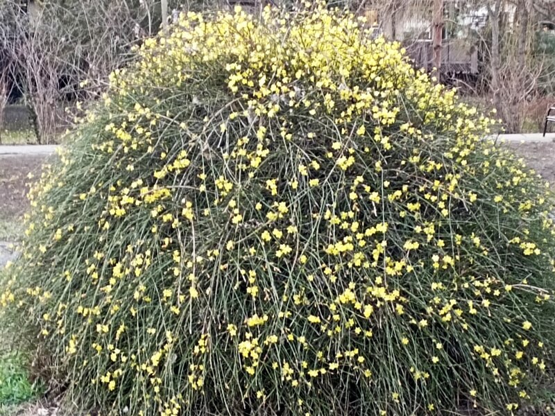 Hogy ne csak a lágyszárúakról essék szó, íme az egyik legkorábbi, valójában már télen is virágzó cserjénk, a téli jázmin. Alacsony termetű, ázsiai eredetű dísznövény, leívelő hajtásrendszerrel – erről már messziről felismerhető, amolyan „pulikutya” forma… :)